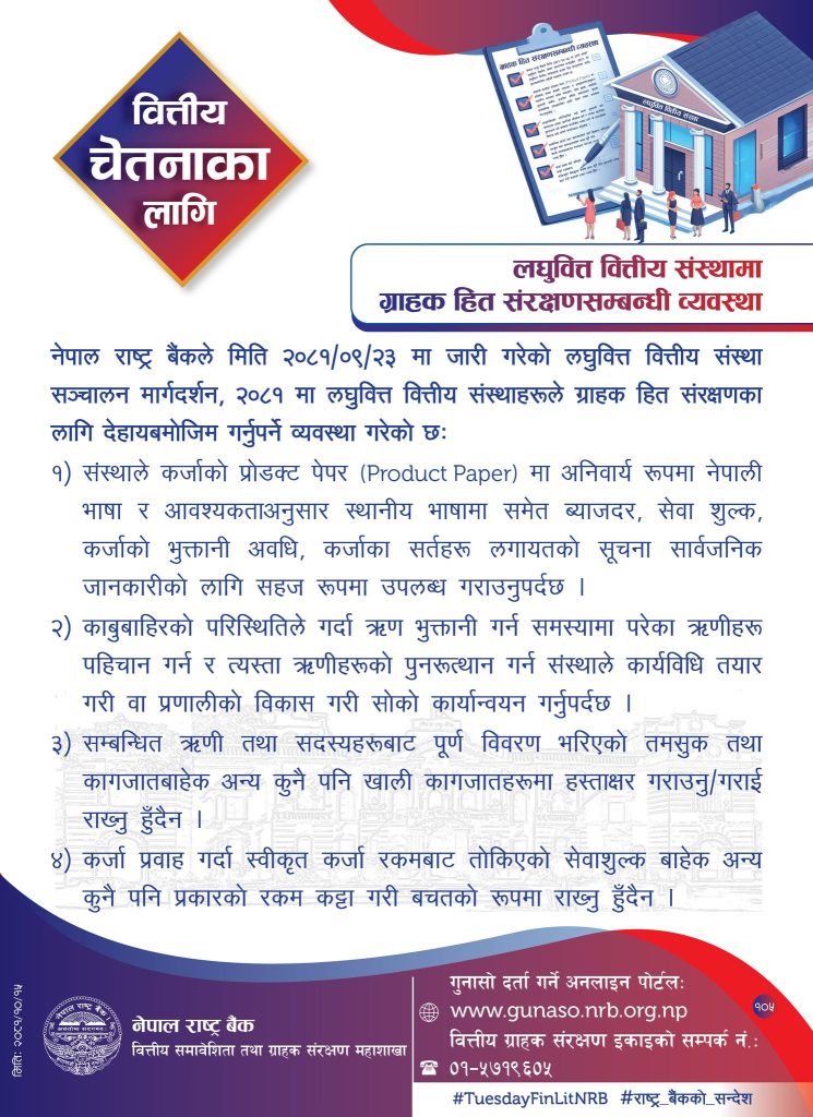 लघुवित्त न्यूज/ नेपाल राष्ट्र बैंकले लघुवित्त वित्तीय संस्थाका ग्राहकको हित संरक्षणका लागि विभिन्न व्यवस्था कायम गरेको छ। केन्द्रीय बैंकले गत पुस २३ गते लघुवित्त वित्तीय संस्था सञ्चालन मार्गदर्शन, २०८१ जारी गरेको थियो। सोही मार्गदर्शनमार्फत राष्ट्र लघुवित्त संस्थाका ग्राहकको हित संरक्षणका लागि विभिन्न व्यवस्था कायम गरेको हो।