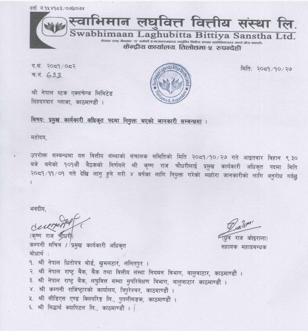 लघुवित्त न्यूज । स्वाभिमान लघुवित्त वित्तीय संस्था लिमिटेडको प्रमुख कार्यकारी अधिकृतमा कृष्णराज चौधरीलाई नियुक्त गरिएको छ । उनलाई कम्पनीले फागुन १ गतेदेखि लागु हुनेगरी आगामी चार वर्षको लागि प्रमुख कार्यकारी अधिकृत पदमा नियुक्त गरेको छ ।